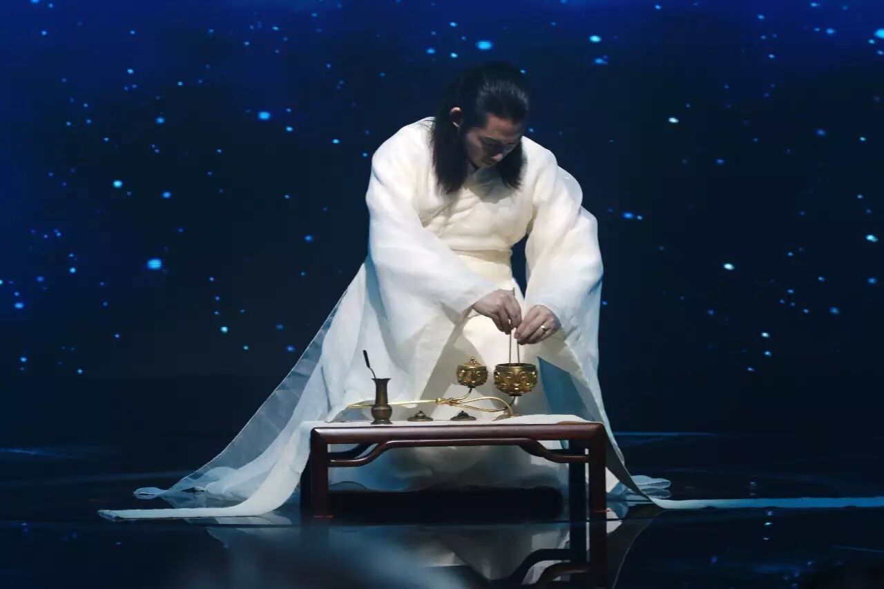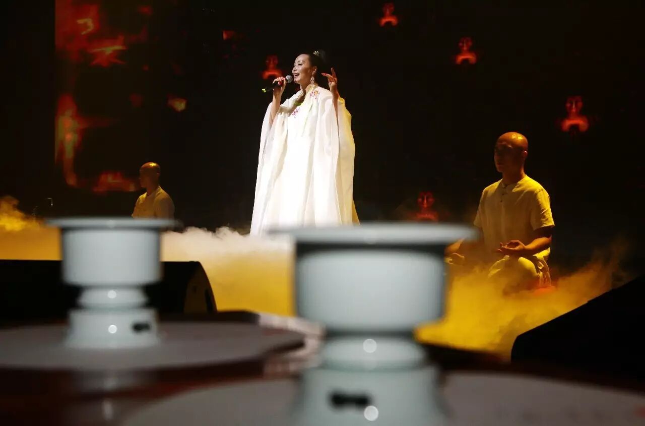 宋程大昌《演繁露》卷七“行香”条记载:“行香即释道之谓行道烧香也。行道者,主斋之人亲自周行道场之中;烧香者,爇之于炉也。”本次音乐会香学艺术家罗子杰先生手持唐鎏金莲花长柄行炉,十位香仙子手捧高足宽沿行炉,依照古代活动礼仪制度行香开场。“中华香礼”作为本次音乐会第一乐章的前奏,依据“番王礼佛图”、“南诏图传”等重要文献的记载,重现古代盛事活动中的行香礼。罗子杰先生为此专门创作炉香赞“一朵莲花开,无上生妙法;炉香结云莲华界,诸佛海会十方熏;氤氲聚散香云盖,拈花一笑无量尊;是莲华、南无云;戒定真香,无量芬。”