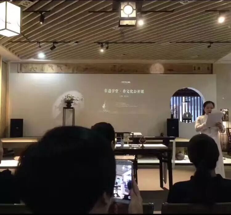 6月14日下午,在东阳中国木雕城二期非遗学堂,来自东阳、义乌等地的100多名香文化爱好者共同参与了本次公益讲座。太月香学创始人罗子杰先生为现场的各位香友讲述了中国香文化历史发展过程以及四大名香,并由香道师陈翔先生为大家演示了流行于宋代的隔火熏香。在互动环节中,爱好者们共同品鉴了四大名香“沉檀龙麝”,还针对日常用香的正确选择及沉香的药用价值、日常运用等话题进行了深入探讨。